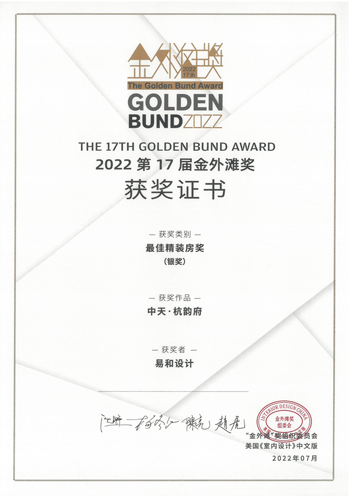 2022年7月27日,第十七届“金外滩”奖颁奖典礼在青岛金水皇冠假日酒店隆重举行。16个类别、200个大奖的获奖名单正式出炉!近260位来宾共同见证了这一激动人心的时刻。由EH DESIGN GROUP 易和设计集团主创的<中天·杭韵府>、<金地威新科技园>分获2022年第十七届“金外滩”奖最佳精装房奖银奖、最佳办公空间奖入围奖!