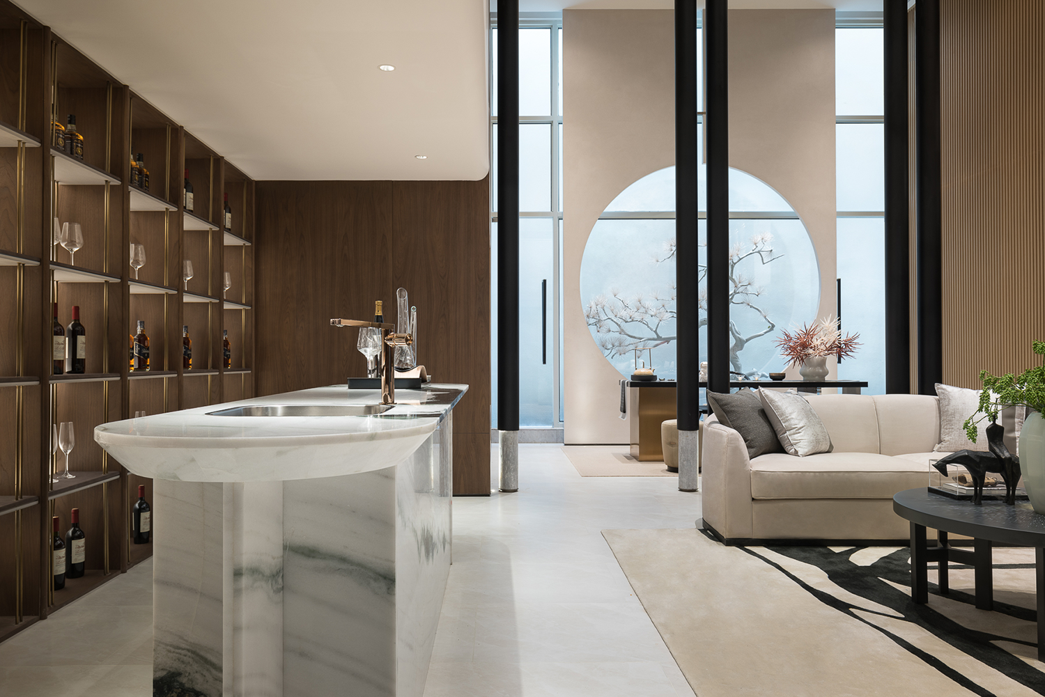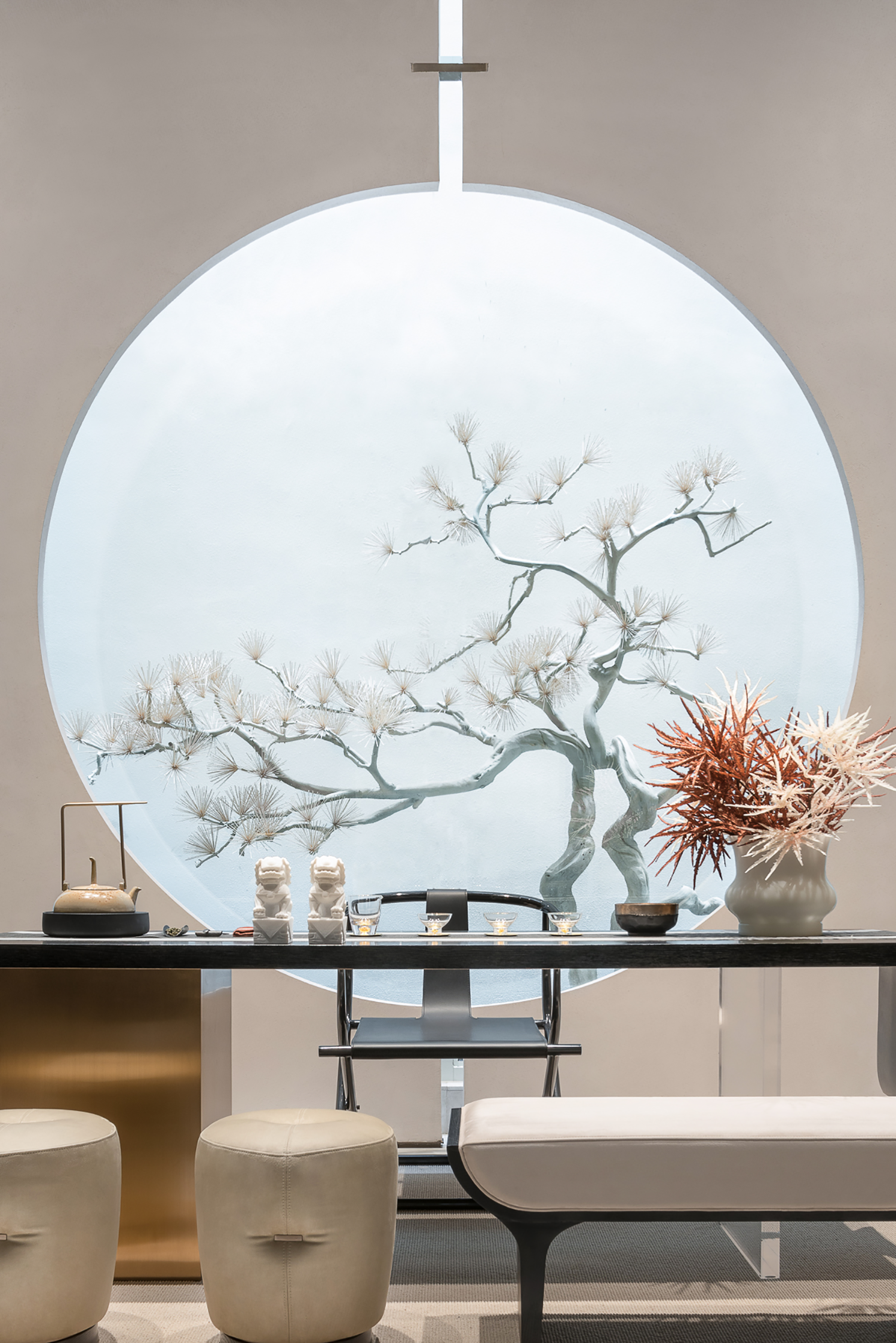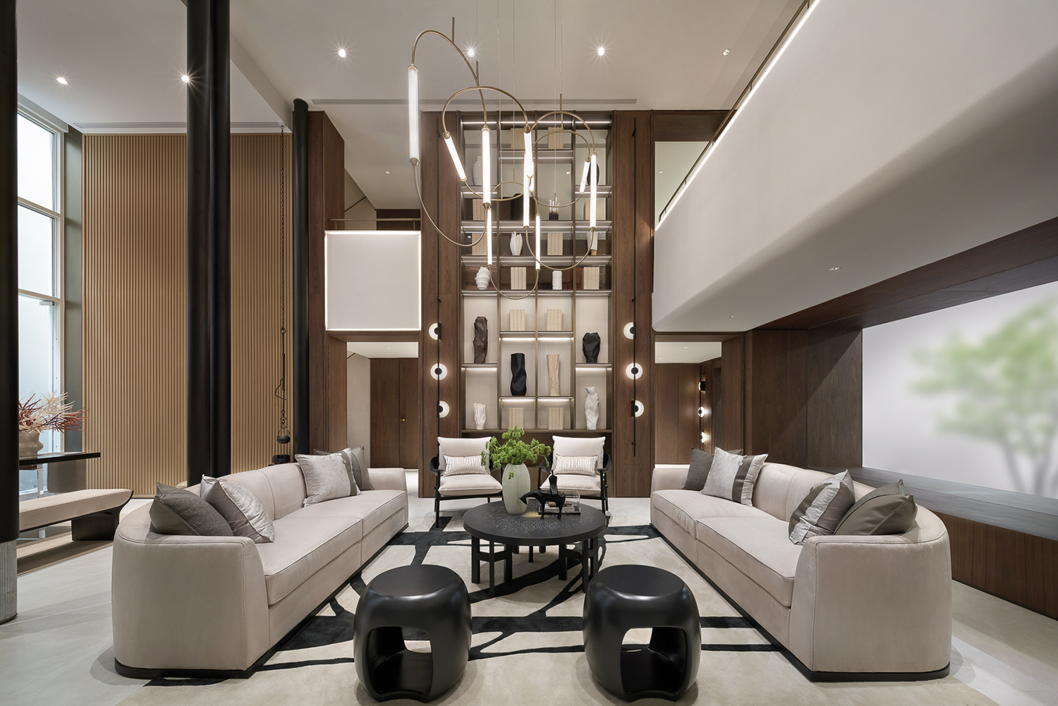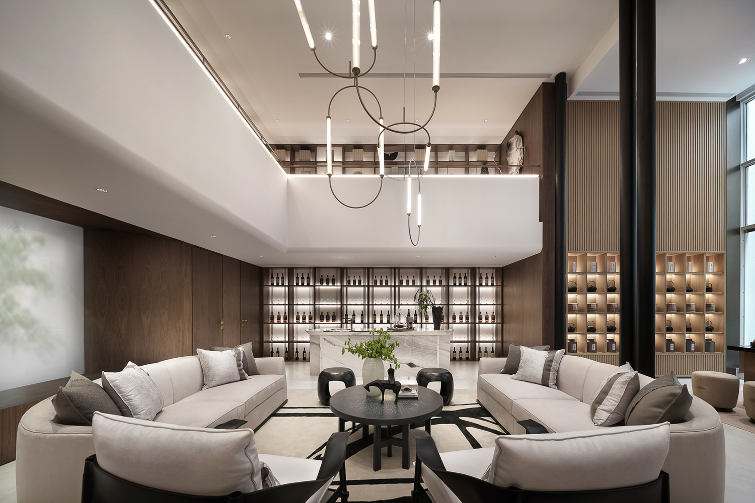 从自然山水中提取古典元素,以黑白灰作为空间的主要色调,以米咖色作为空间的点缀色,将传统美学渗透进山水城市生活的日常之中,以此来表达气韵神游的清峻洒脱之风。