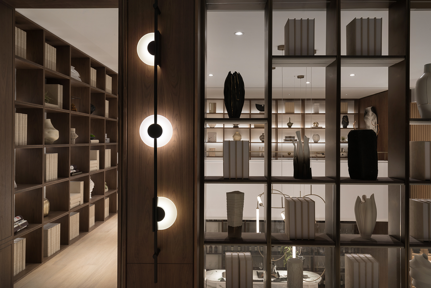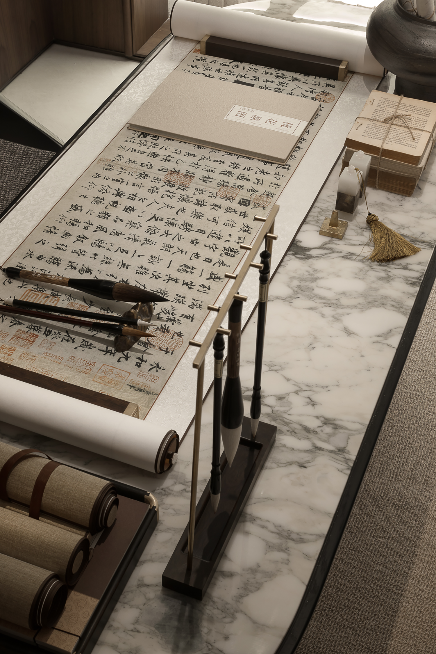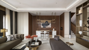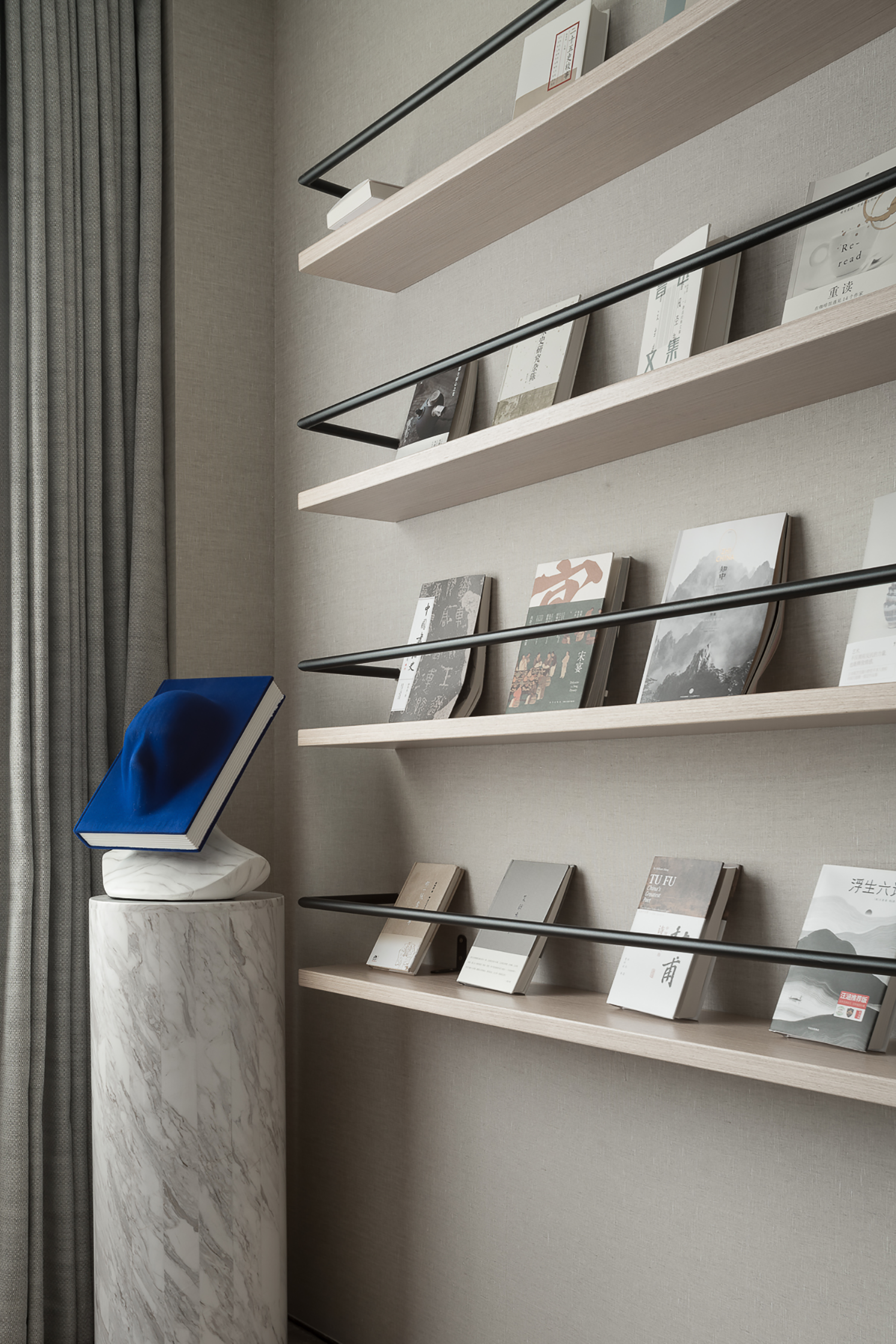 从自然山水中提取古典元素,以黑白灰作为空间的主要色调,以米咖色作为空间的点缀色,将传统美学渗透进山水城市生活的日常之中,以此来表达气韵神游的清峻洒脱之风。