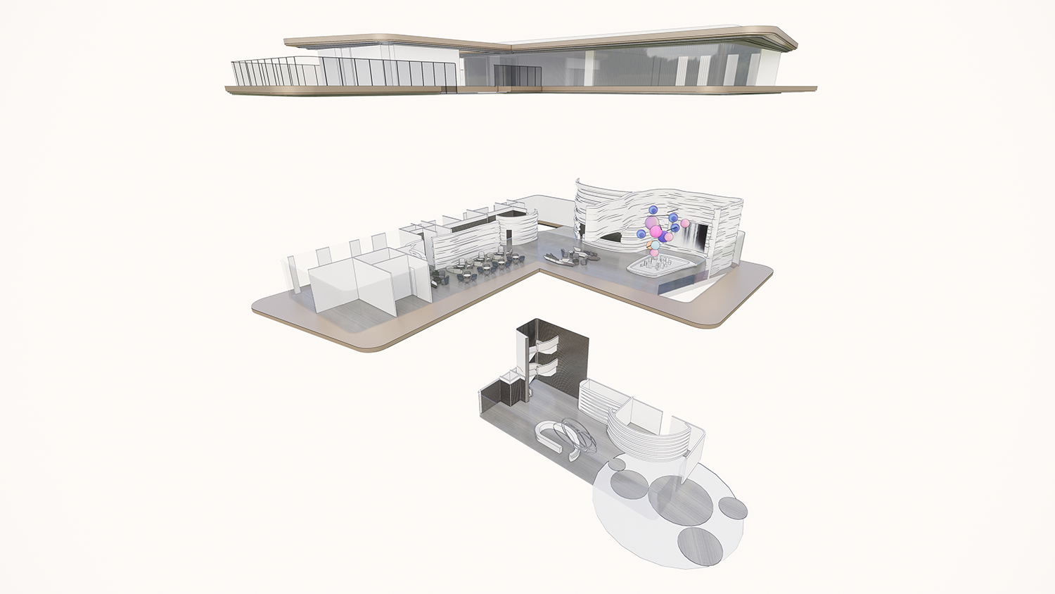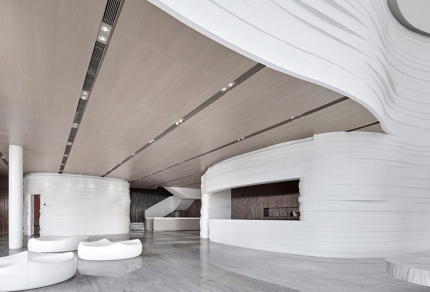 古楚巫音奇异、诡谲、典雅的音调,古朴、严谨、规范的结构形态,反映了楚人的生活情绪和精神面貌。本案将巫音无形的音律美具象化,整个空间形态如一段凝固的优美旋律落于水面之上,美得大气恢弘。