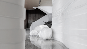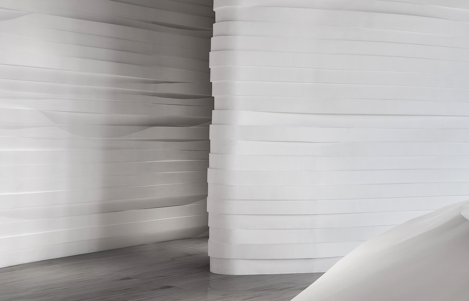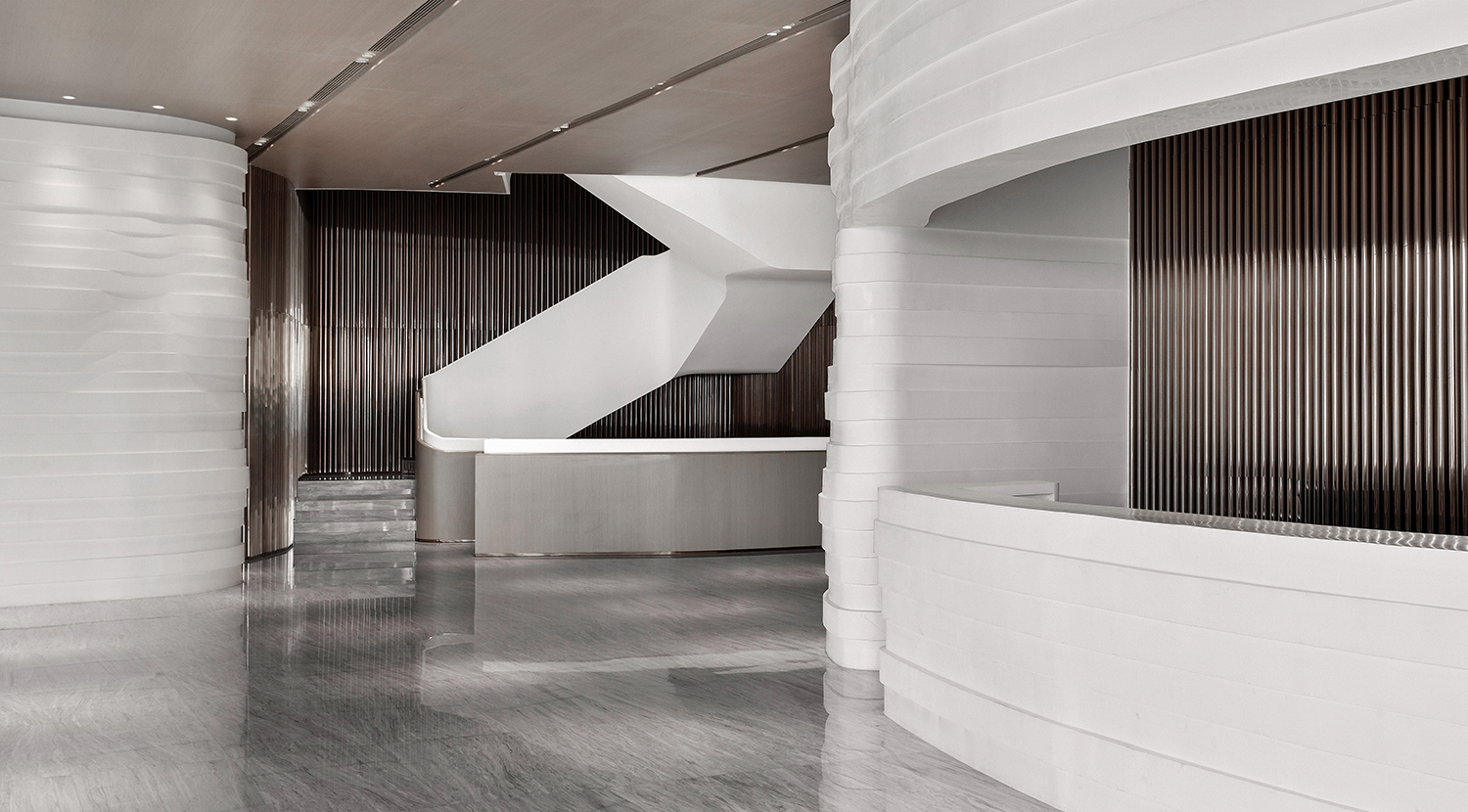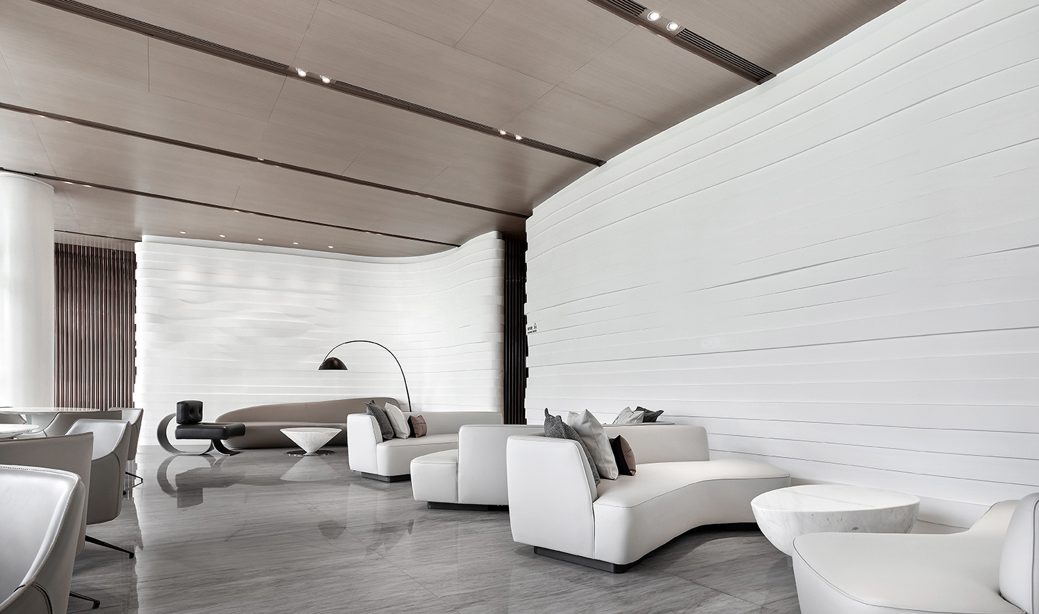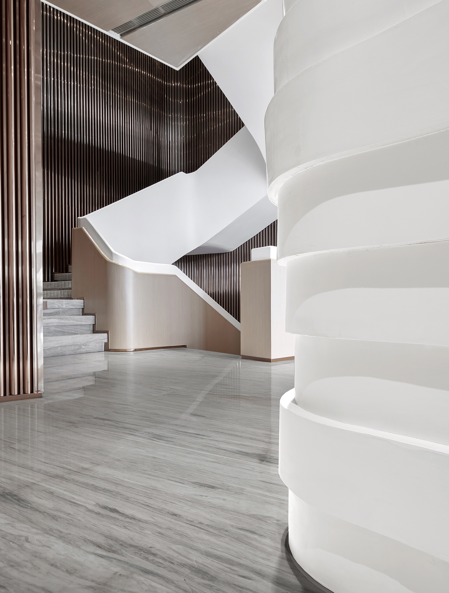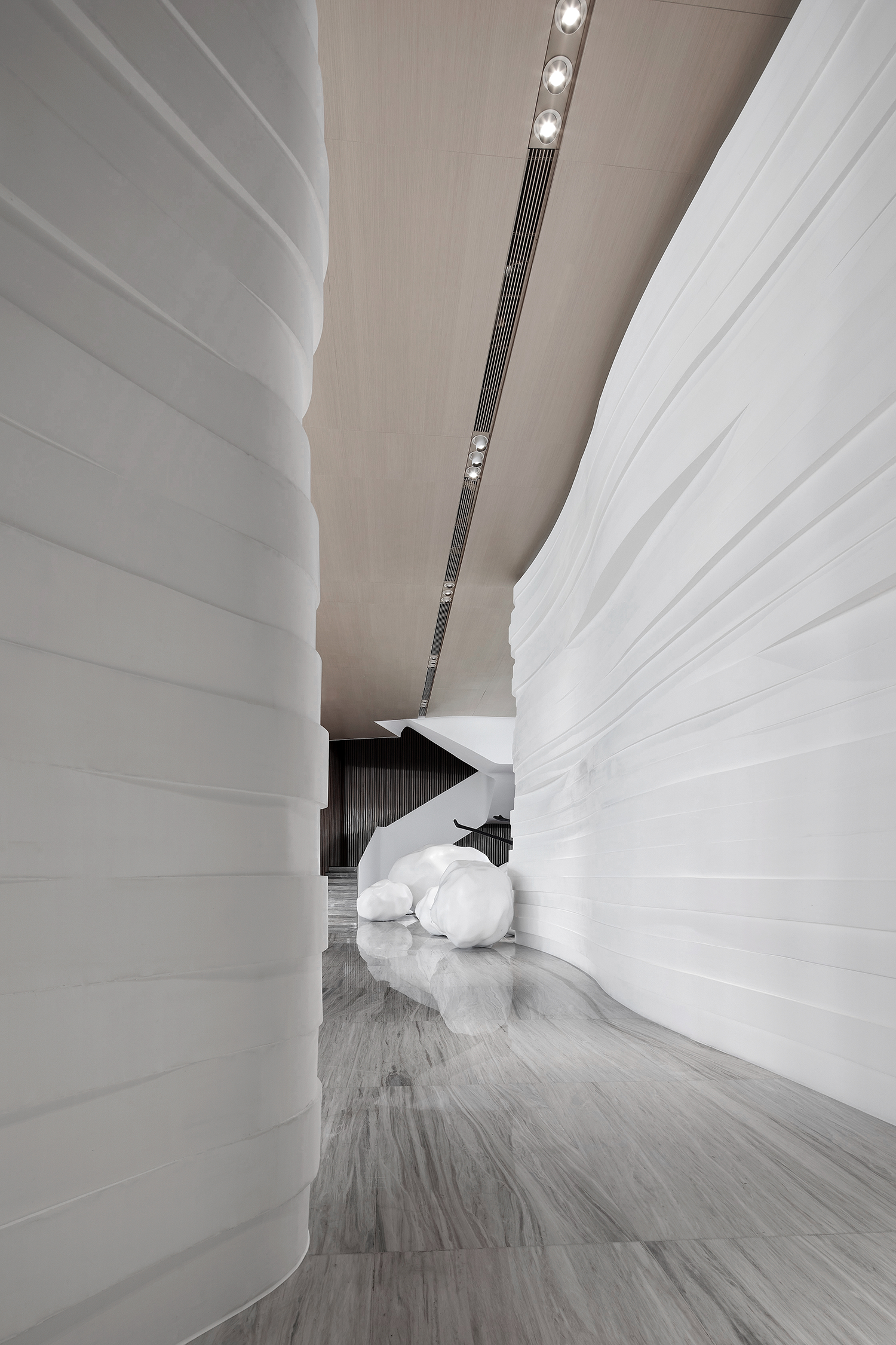 墙面造型曲线流畅延伸盘桓,赋予空间律动感,虚实起伏之间让人恍惚看到铁马金戈刀剑如梦的古城侠气,镜面金属线条则勾勒现代风格的精致考究。原木色地板、天花与白色墙面和谐映照,色彩柔美舒适。