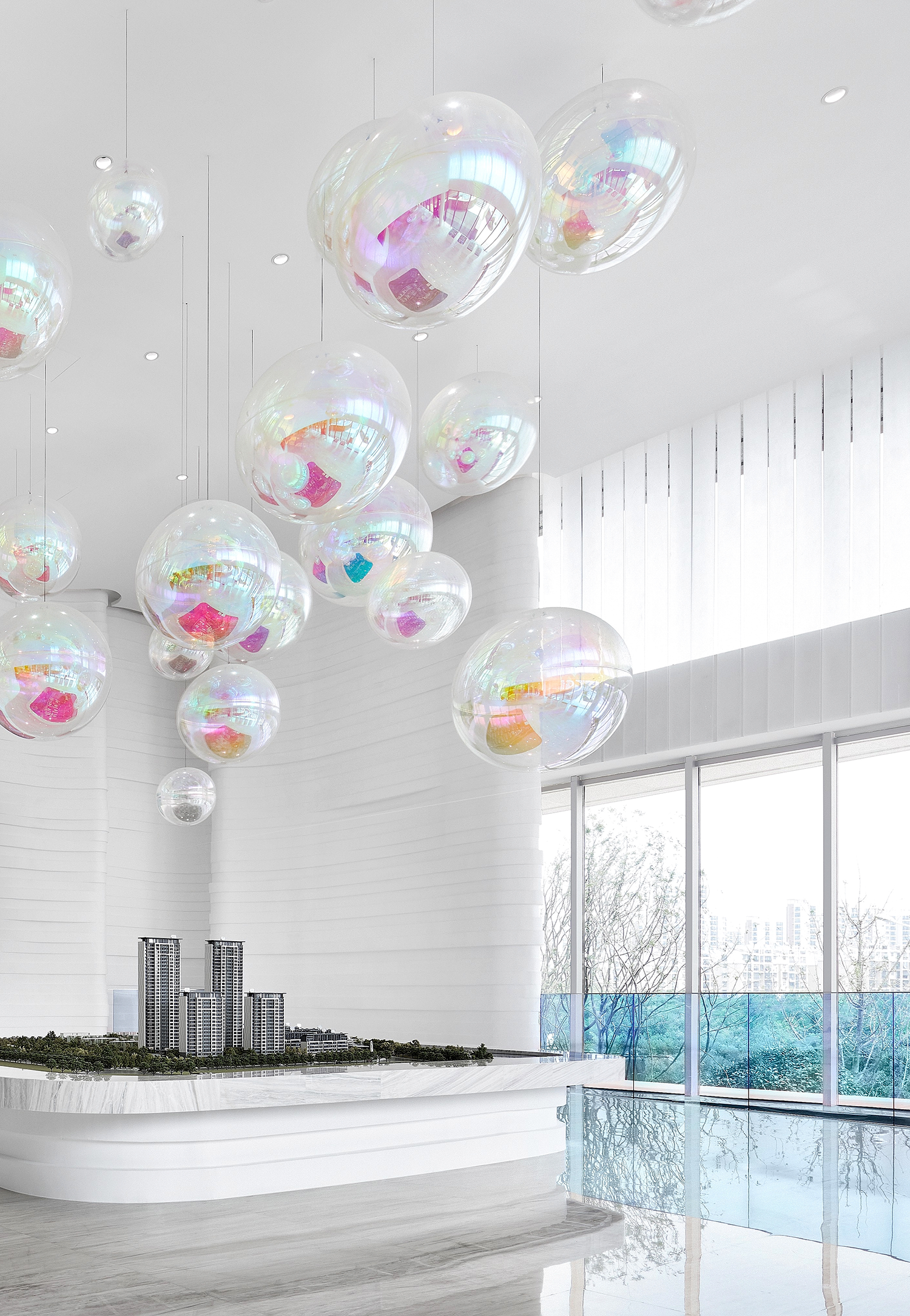 沙盘中空设异形装饰,表达“珠”落之意。鲜艳的色彩与朴素的空间底色形成强烈的对比,极具冲击力。